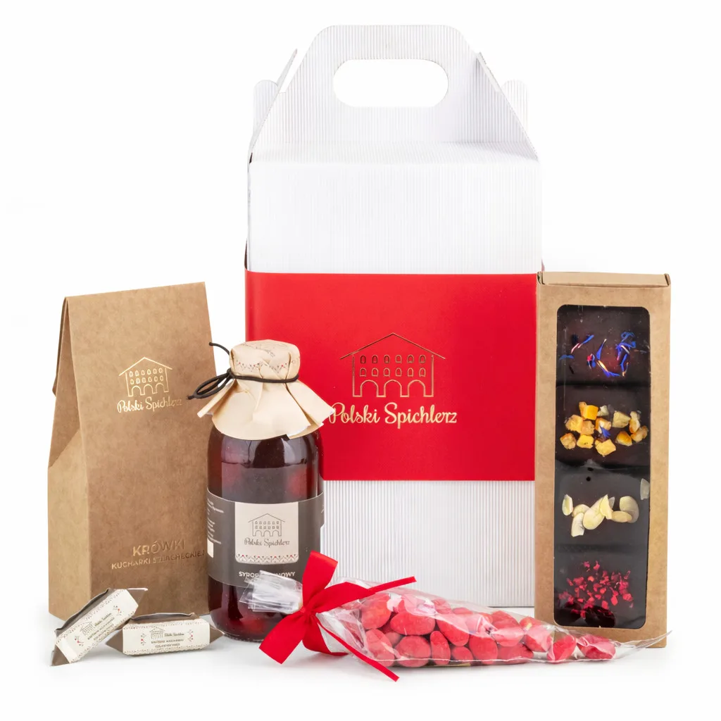 Całość w pudełku z tekstury falistej z banderolą z logo Polski Spichlerz z uchwytem.