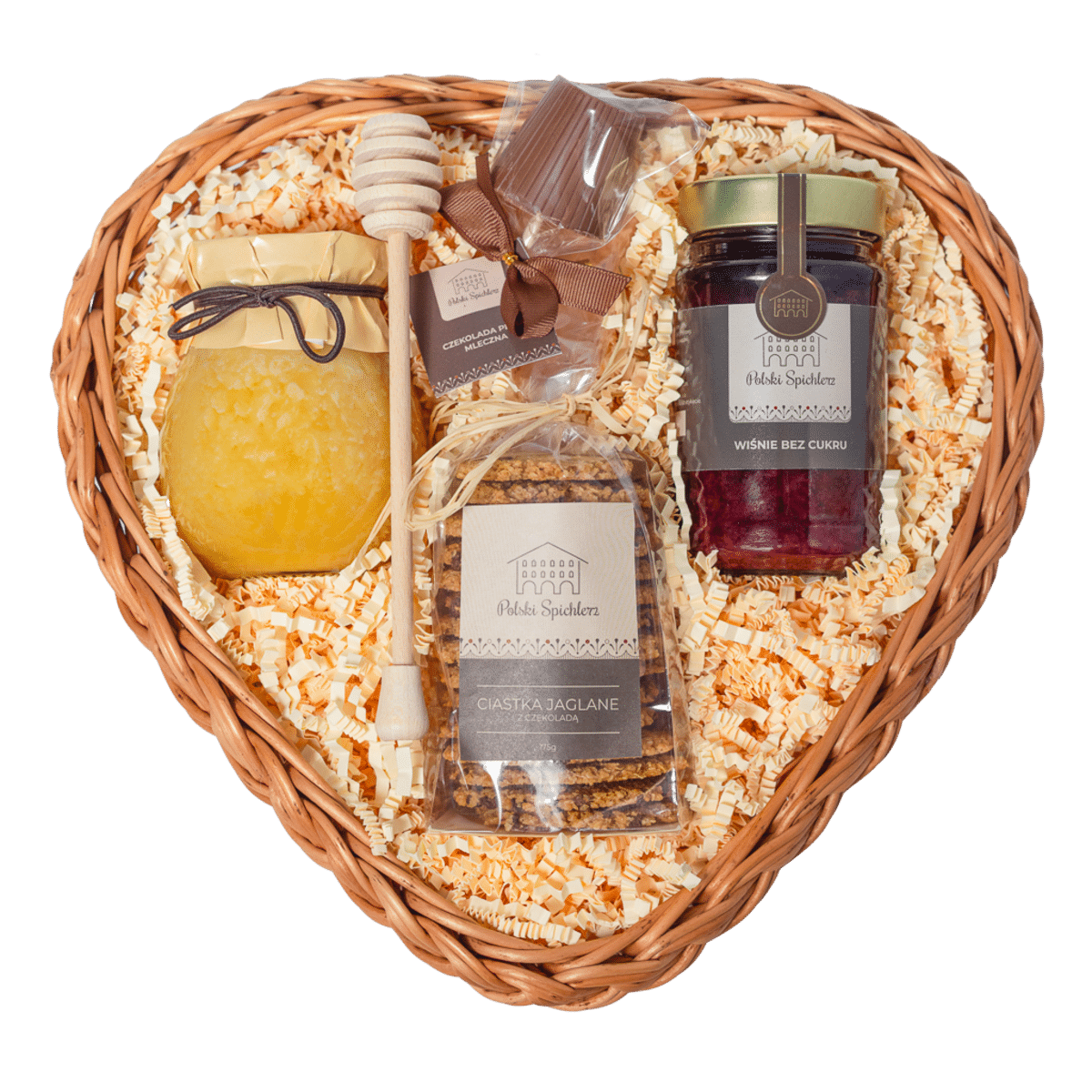 Całość w wiklinowym koszu w kształcie serca zawiniętym w folię celofanową.