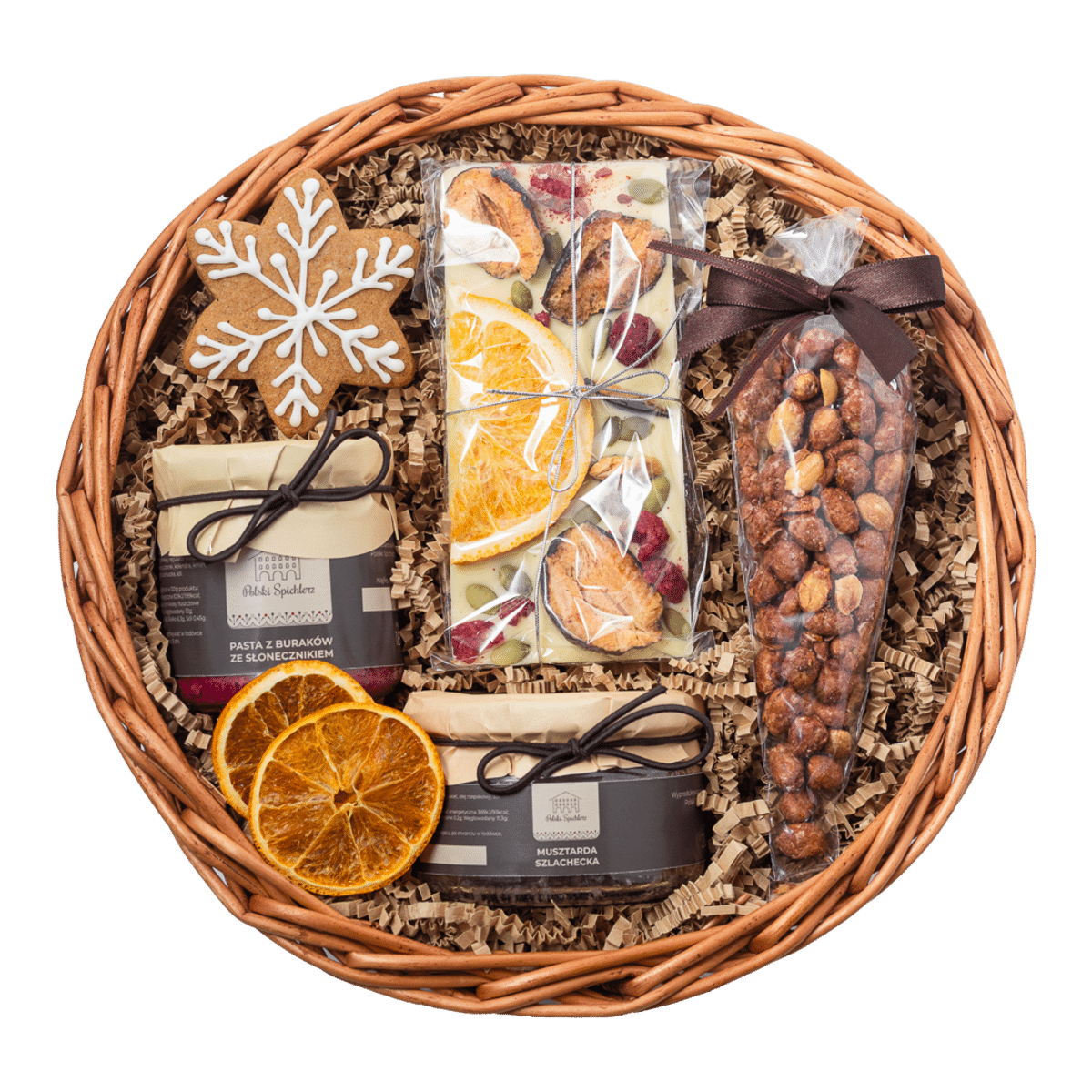 Całość w okrągłym wiklinowym koszu zawiniętym w folię celofanową.