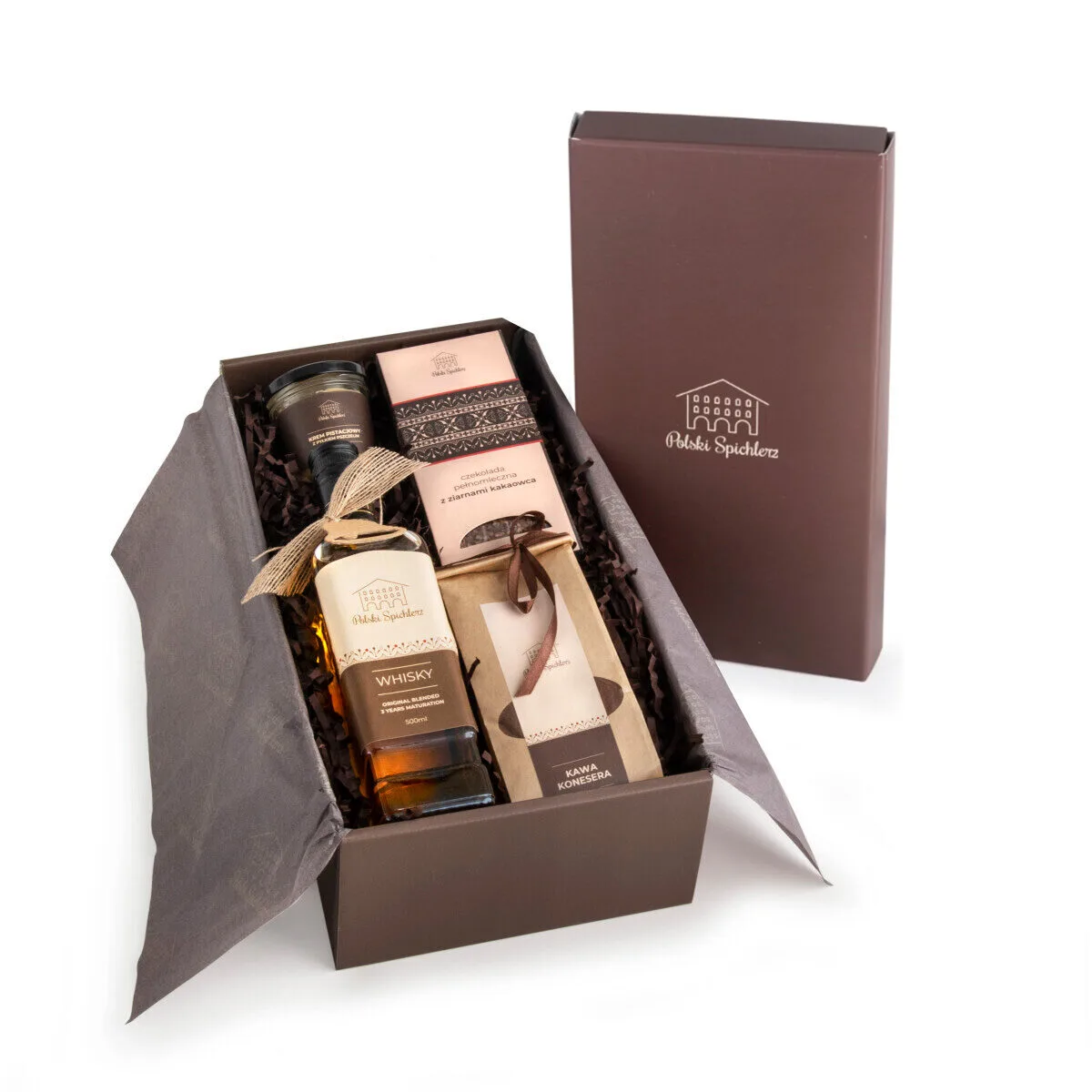 Produkty zawinięte w ozdobny pergamin z logo Polski Spichlerz zamknięty stickerem.