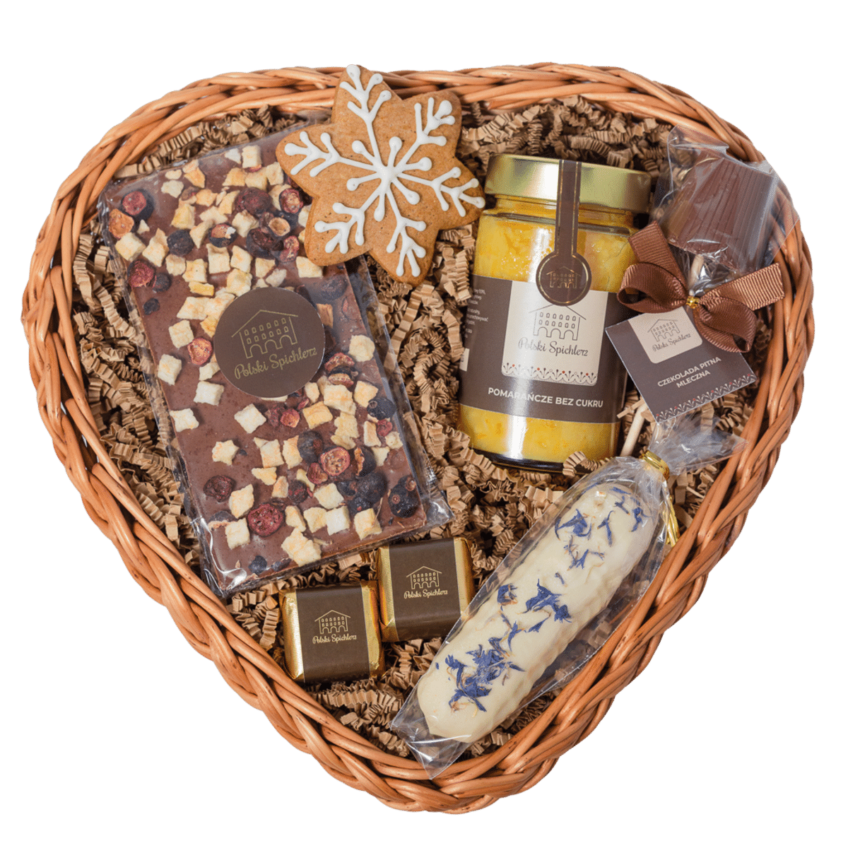 Całość w wiklinowym koszu w kształcie serca zawiniętym w folię celofanową.