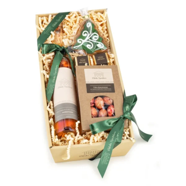 Całość w ozdobnej tacy z logo Polski Spichlerz przewiązanej wstążką.