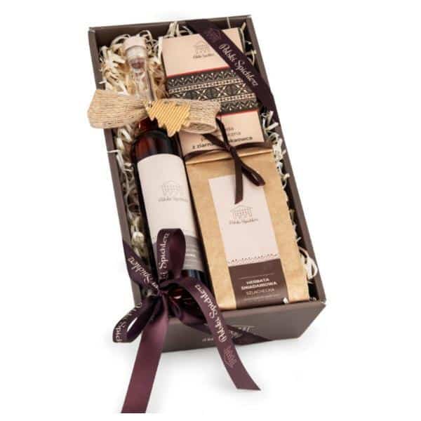 Całość w ozdobnej tacy z logo Polski Spichlerz przewiązanej wstążką.