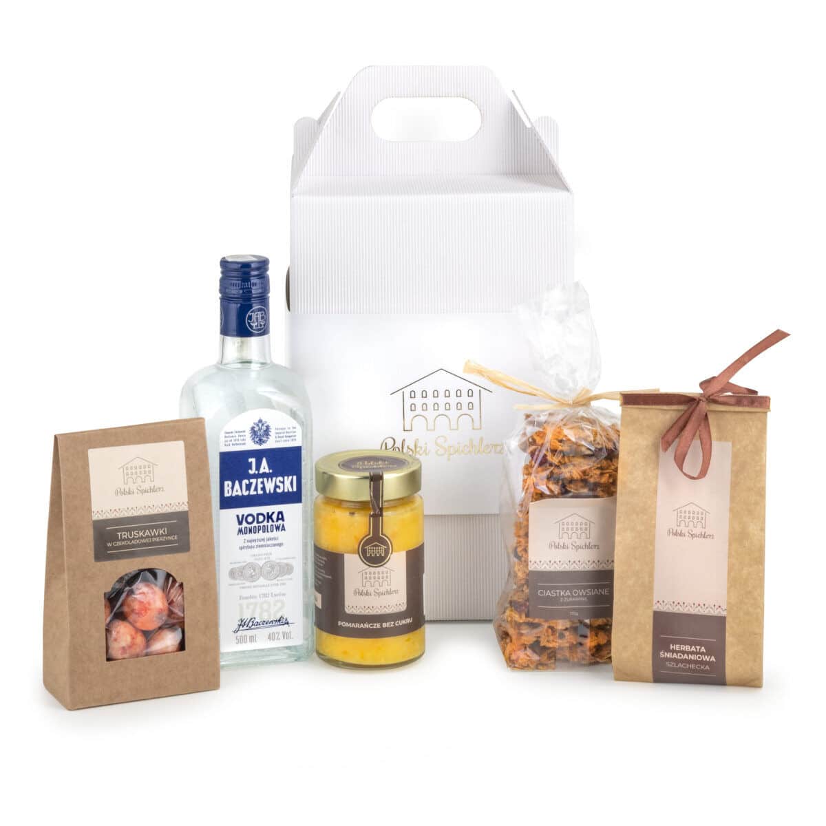 Całość w pudełku z tekstury falistej z banderolą z logo Polski Spichlerz z uchwytem.