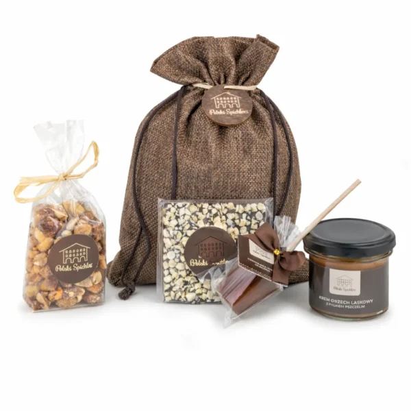 Całość w jutowym woreczku z zawieszką z logo Polski Spichlerz.