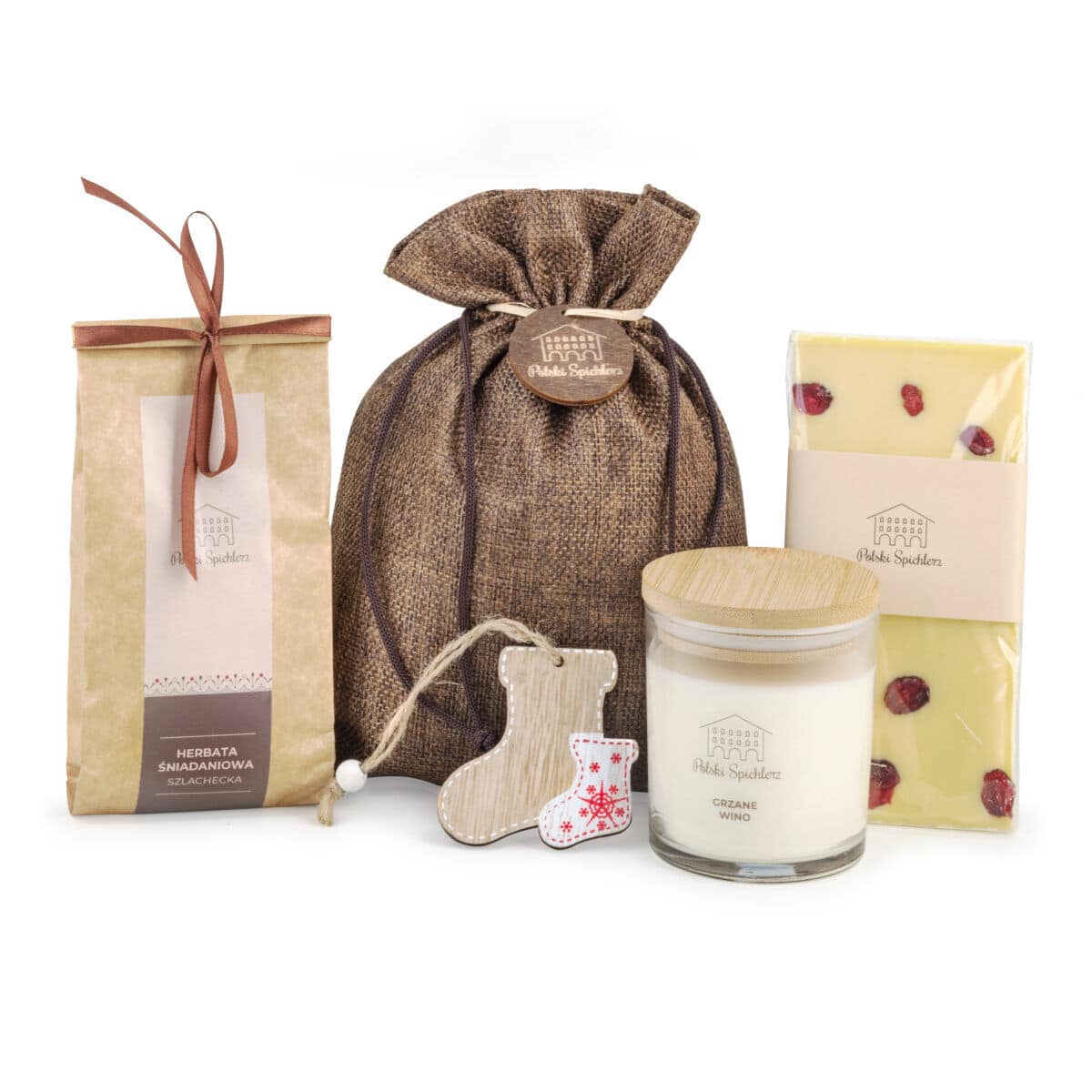Całość w jutowym woreczku z zawieszką z logo Polski Spichlerz.