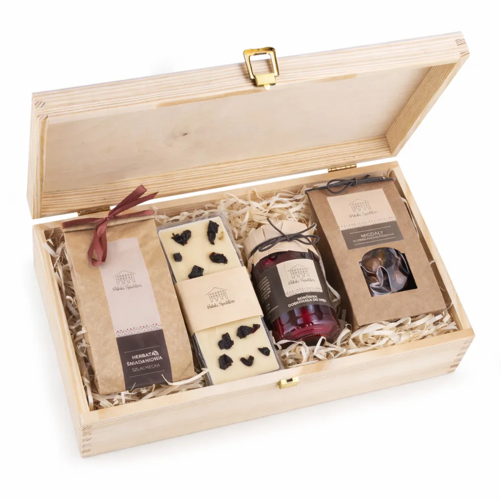 Całość w drewnianej, naturalnej skrzyni zamykanej na zamek przewiązanej wstążką z logo Polski Spichlerz.