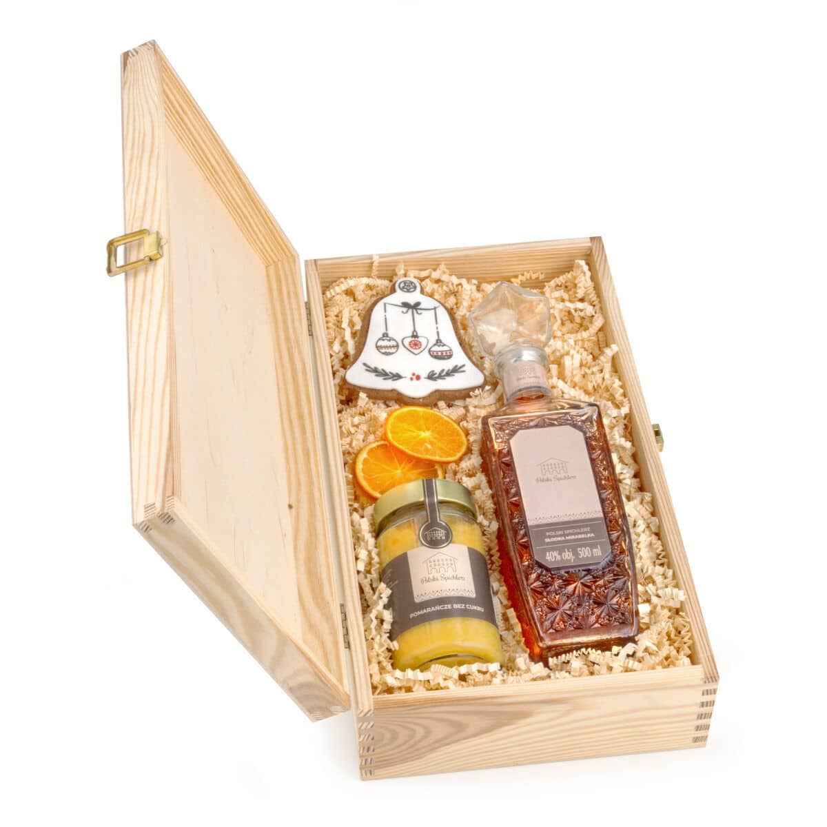 Całość w drewnianej, naturalnej skrzyni zamykanej na zamek.