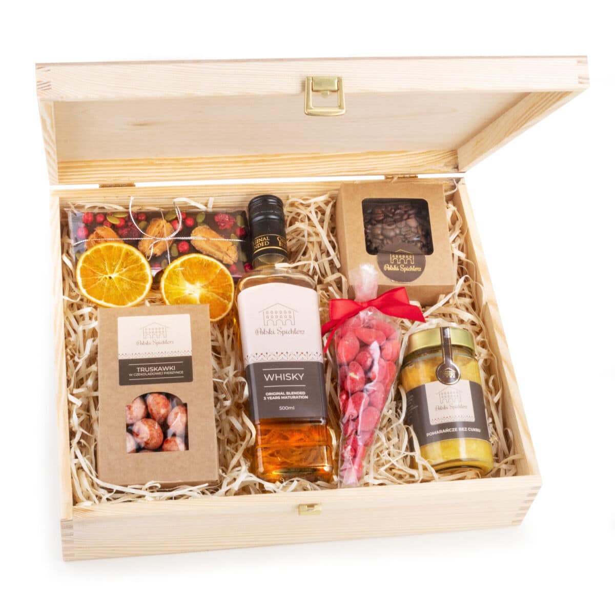 Całość w drewnianej, naturalnej skrzyni zamykanej na zamek przewiązanej wstążką w wybranym kolorze z logo Polski Spichlerz.
