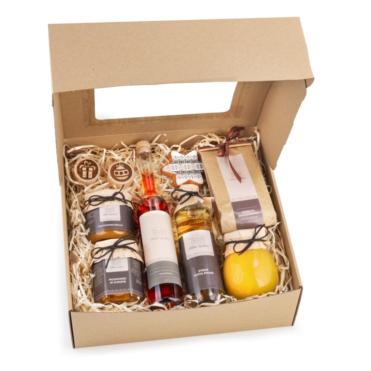 Całość w czarnym pudełku eko z okienkiem, przewiązanym wstążką z logo Polski Spichlerz w wybranym kolorze.