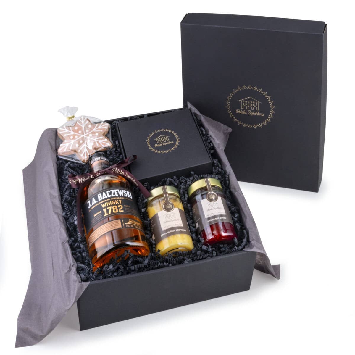Całość w eleganckim czarnym pudełku ze złoceniem logo Polski Spichlerz.