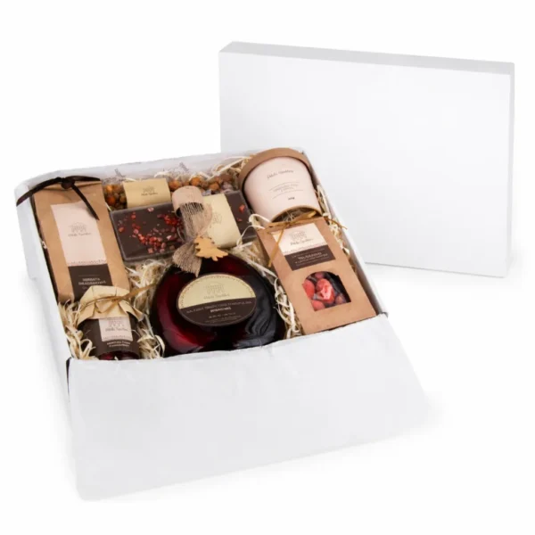 Całość w ręcznie kaszerowanym pudełku z wypełnieniem, przewiązanym wstążką z logo Polski Spichlerz.