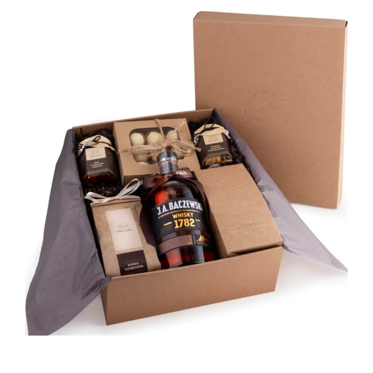 Produkty zawinięte w ozdobny pergamin z logo Polski Spichlerz zamknięty stickerem.