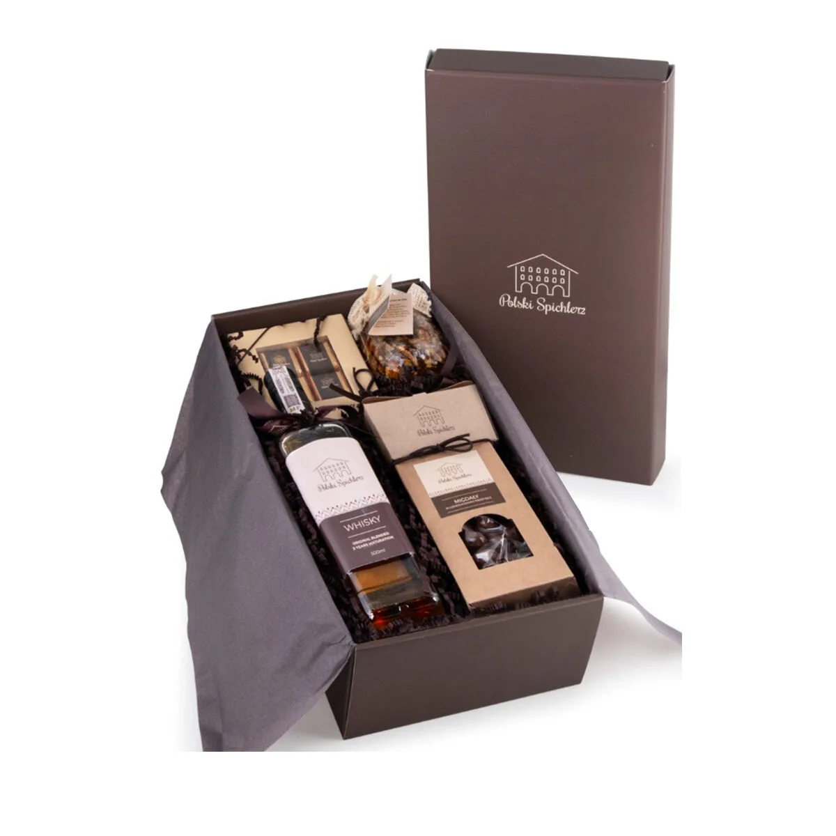 Produkty zawinięte w ozdobny pergamin z logo Polski Spichlerz zamknięty naklejką.