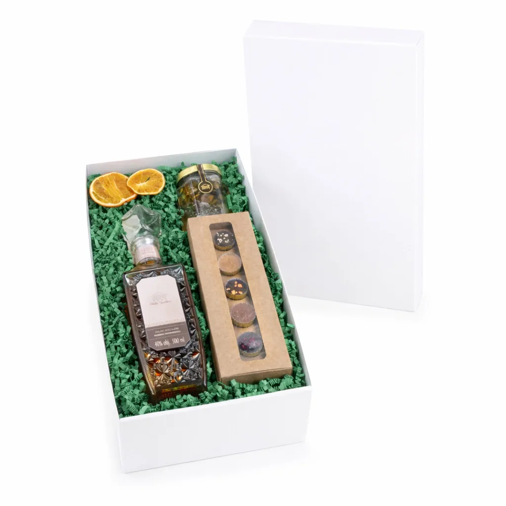 Całość w ręcznie kaszerowanym pudełku z wypełnieniem i wstążką z logo Polski Spichlerz.