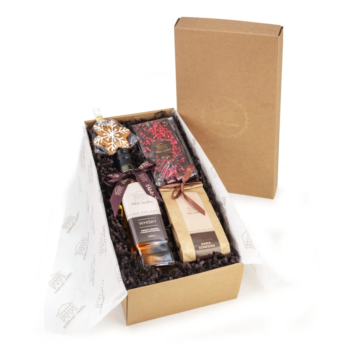Produkty zawinięte w ozdobny pergamin z logo Polski Spichlerz zamknięty stickerem.