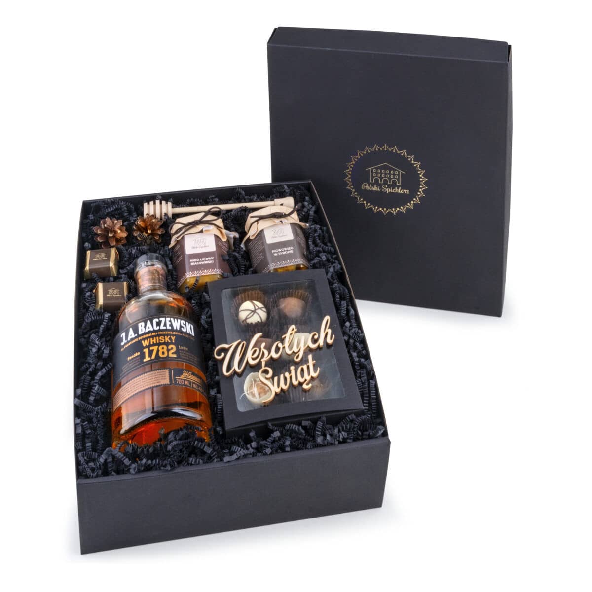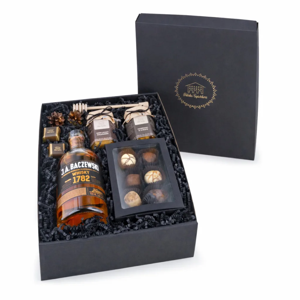 Całość w eleganckim czarnym pudełku ze złoceniem logo Polski Spichlerz.