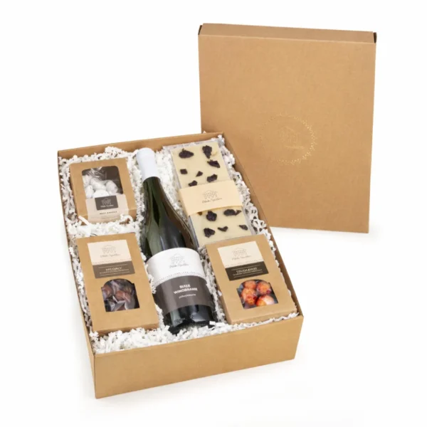 Produkty zawinięte w ozdobny pergamin z logo Polski Spichlerz zamknięty stickerem.