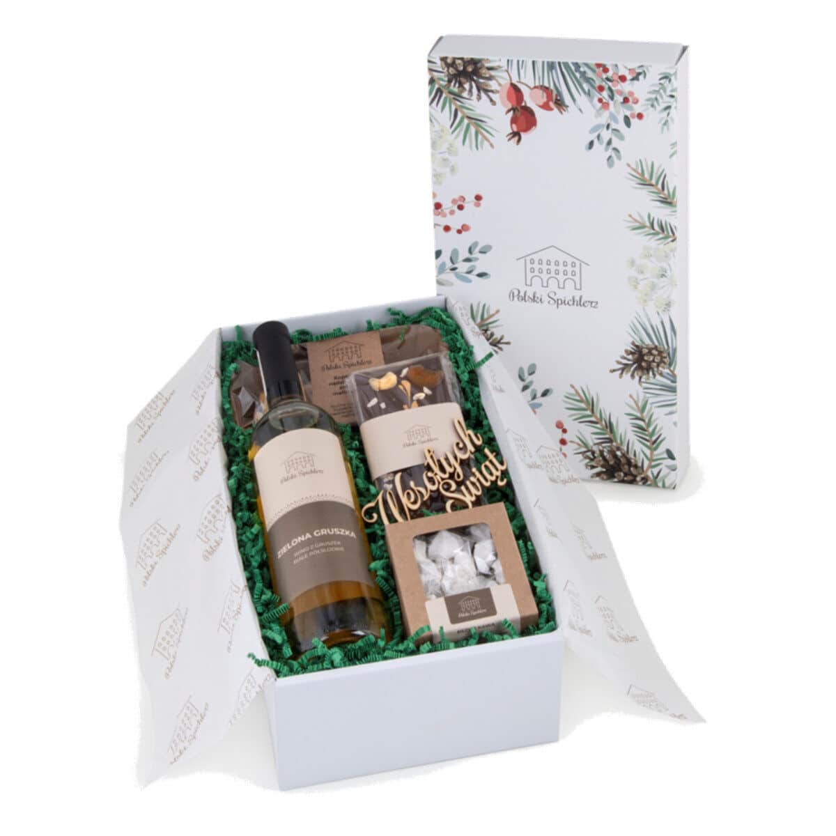 Produkty zawinięte w ozdobny pergamin z logo Polski Spichlerz zamknięty naklejką.