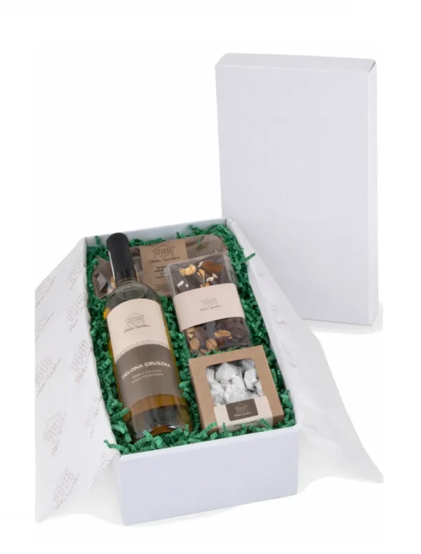 Całość w ręcznie kaszerowanym pudełku przewiązanym wstążką z logo Polski Spichlerz.