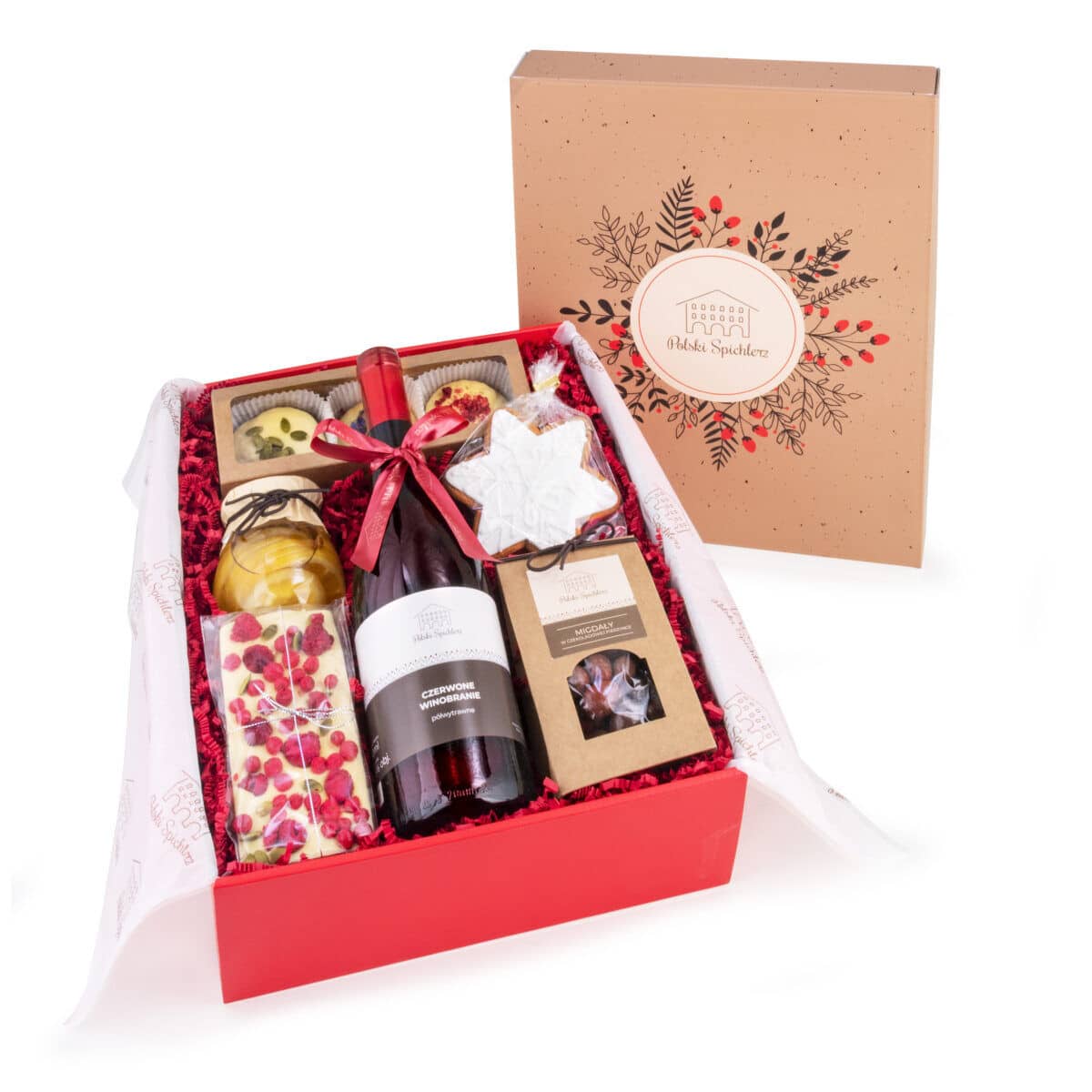 Produkty zawinięte w ozdobny pergamin z logo Polski Spichlerz zamknięty naklejką.