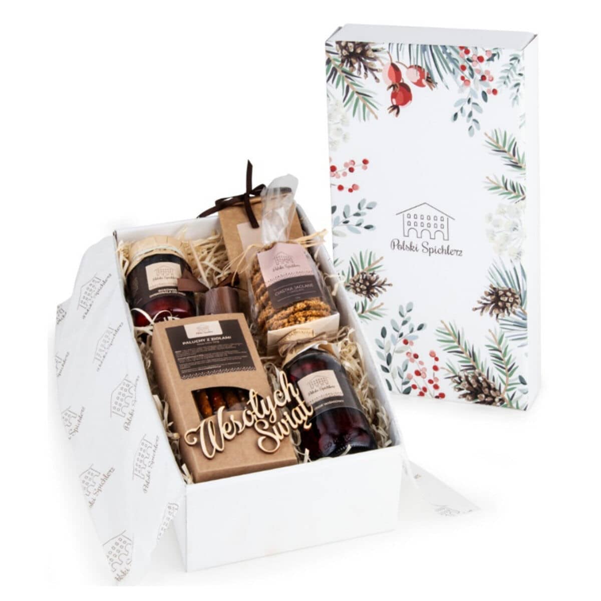 Produkty zawinięte w ozdobny pergamin z logo Polski Spichlerz zamknięty stickerem.