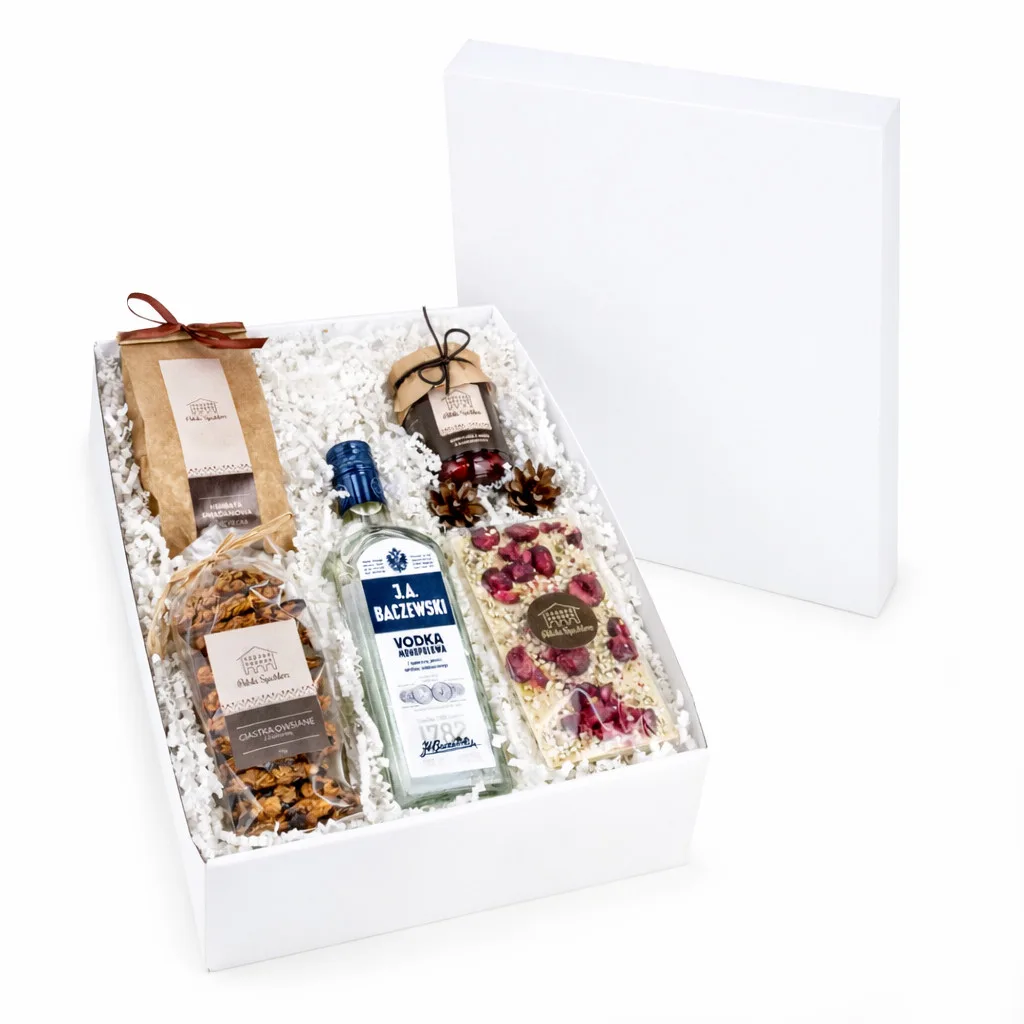 Całość w ręcznie kaszerowanym pudełku z wypełnieniem i wstążką z logo Polski Spichlerz.